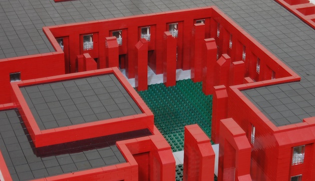 The columns on the exterior may be excessive. I have to work within the units Lego allows. But I like them a great deal. They suggest flying buttresses, though they serve no structural purpose and support nothing. Nor did I add a ceiling to protect from the rain. Rather, I wanted to keep them open, allowing a complex interchange of light and shadows. The columns in the courtyard serve no function whatsoever, though lamps could be put at the top to light it at night. They suggest vaguely any number of constructions from the past, the upright stones of dolmens or Stonehenge, a deconstructed monastic cloister, or whatever interpretation one might want to give. Their varied sizes might suggest a variety of distinct parts making a whole, or the individuals who make a community. Like the exterior columns, they will produce a variety of shadows, marking the passing of time throughout the day, the changing seasons.