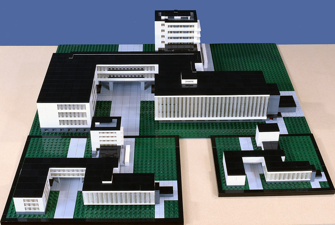 The joy in constructing this model is that it gave me a chance to experience close hand the building’s structure and forms. My frustration is that I could not capture these fully. I am limited by the standard sizes of Lego bricks, and in many cases I had to simplify, delete, exaggerate, or improvise. The roof molding only shows slightly on the facades in the original, for example. Gropius cared about the the appearance of the roof and how the building might be seen from the air. Using white Lego plates to edge the roof would have detracted from its distinctive shape.