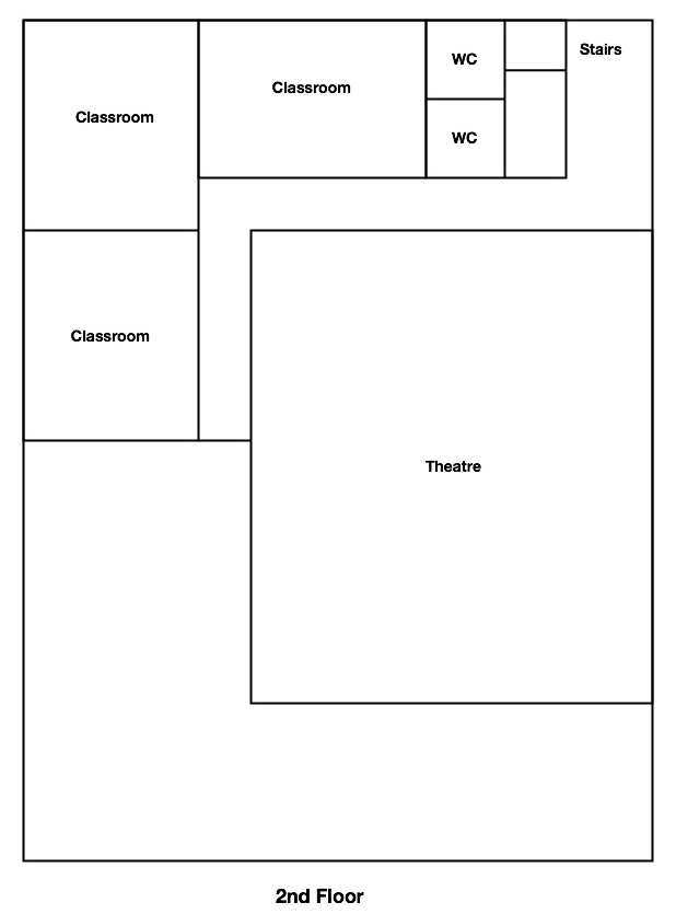 At its core is a black box theater, which is a simple stage, basic, flexible, and functional, and relatively inexpensive, often painted black on the interior to enhance the theatrical experience. The stage is composed of moveable platforms and not much more. Seating can be moved around as well. I estimate it will seat 120 or more. A balcony might be possible. It’s about the same size as Center Stage, at Williams College ‘62 Center for Theatre and Dance, and its floorpan above gives an idea of the space and its use. Mine is about 20 feet high, allowing space for lighting and other stage necessities, and thus extends through the second floor.