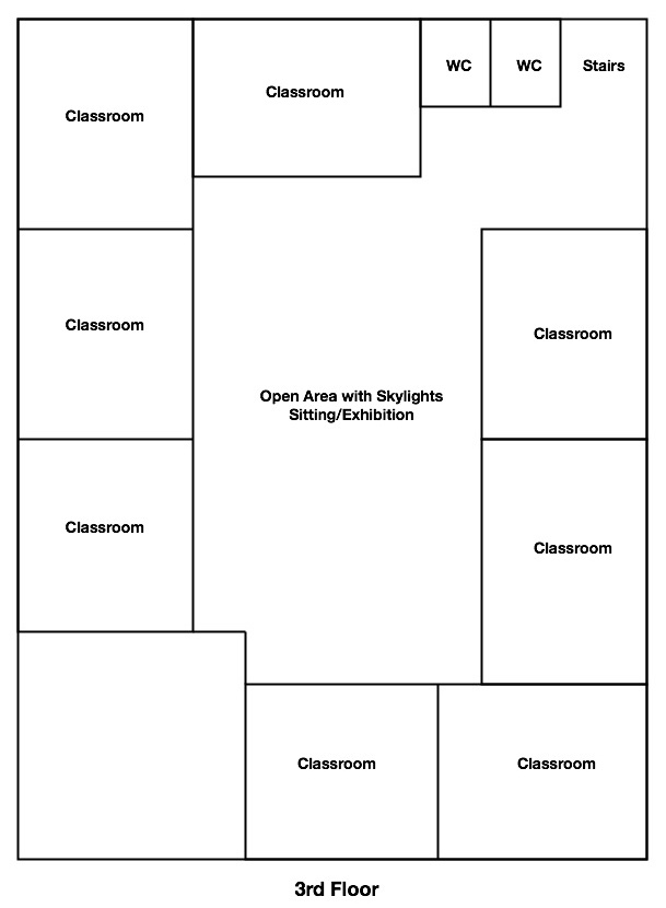 On the third floor, eight more classrooms. The open area could be below skylights and might be another gathering or exhibition space. The classrooms are smallish, seating 15 to 20. This is my fantasy—small classes. I used to be a college instructor who endured overcrowded classes for three decades. Another floor of classrooms could be added.