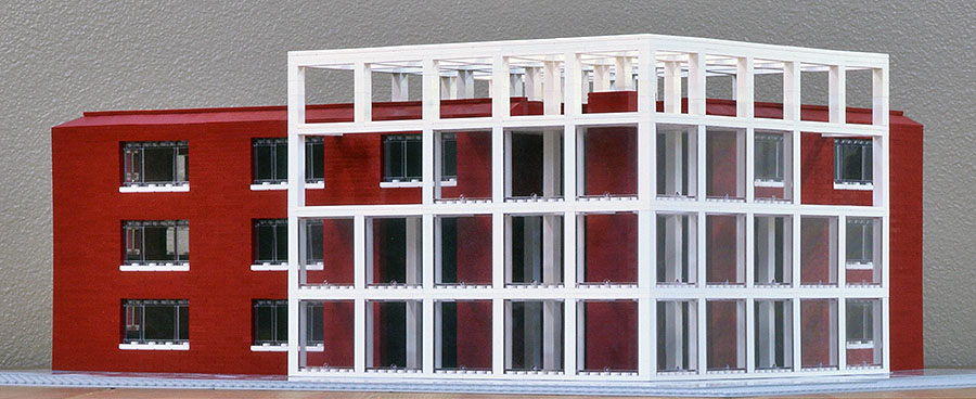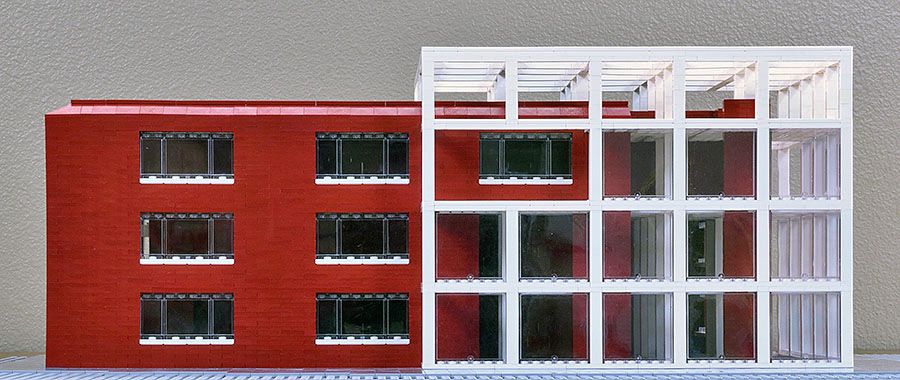 The cube elements aren’t in line with the brick part but are slightly off its imagined grid of construction, again to encourage tension and difference. I followed a rule that the brick building takes precedence when the two intersect, the reason a beam is missing in front of the classroom windows on the third floor. But I also wanted to add some variety to the grid, which needs some dynamics of difference itself.