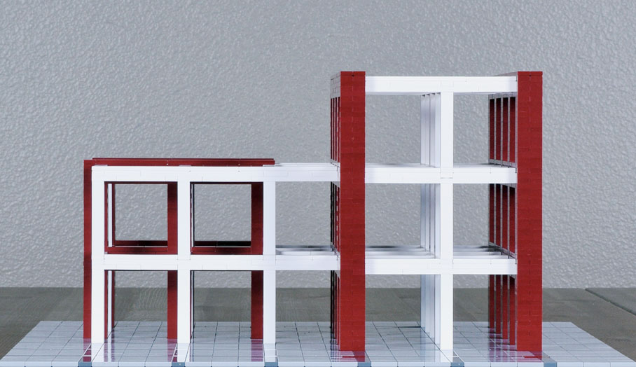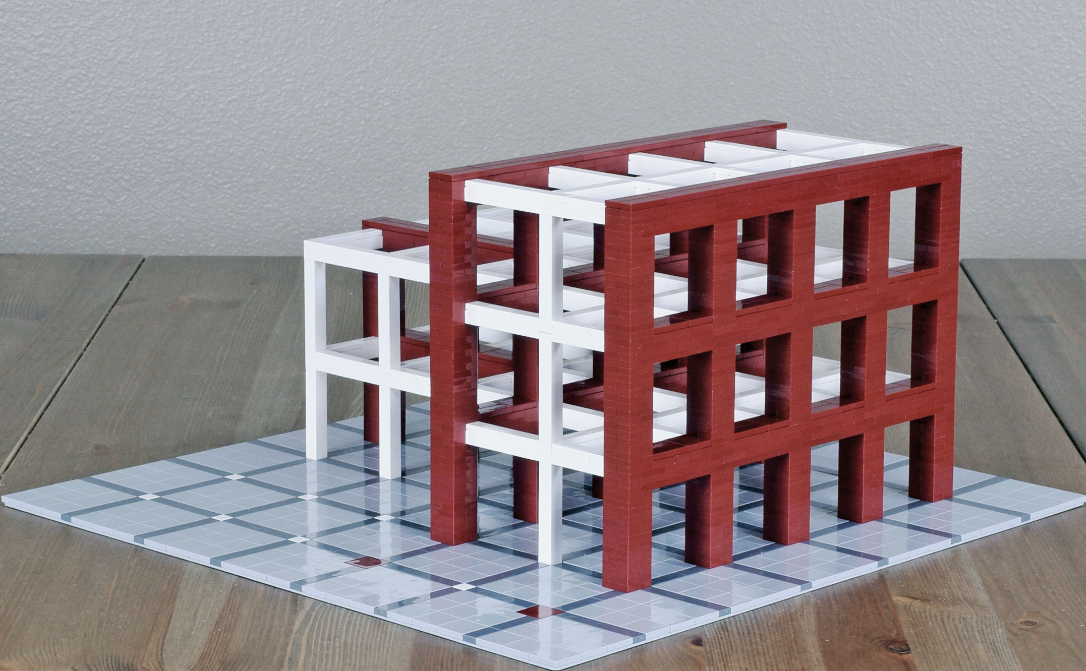 More a non-building than a non-monument that repeats the rational grid of many modern constructions, then separates the implied building into discrete parts. It is laid out on a 5 x 5 x 3 grid, positing a cube with sections missing.