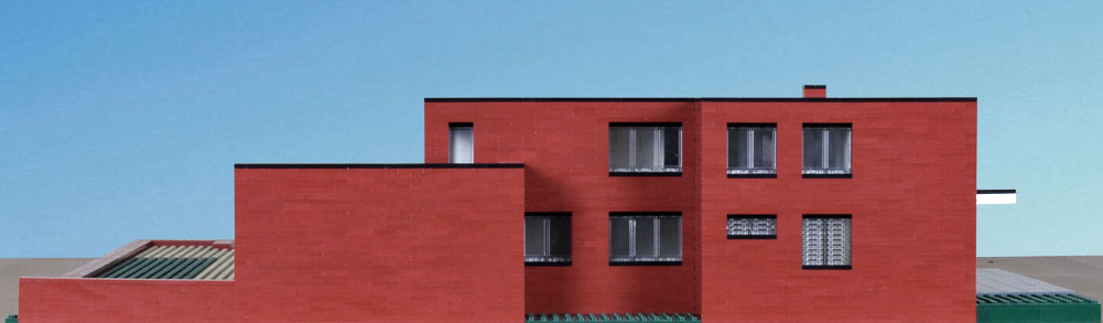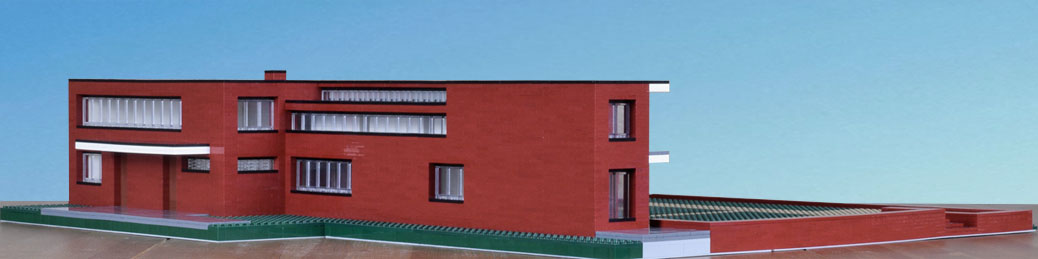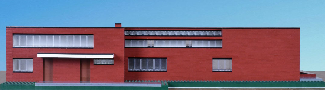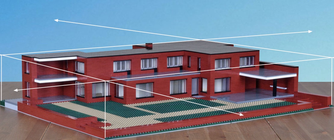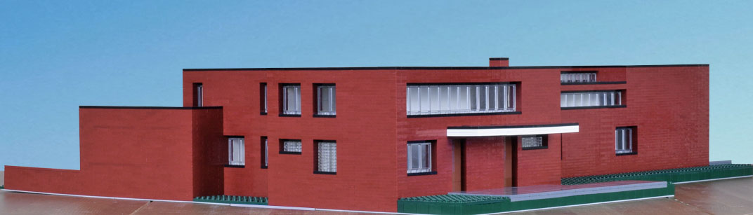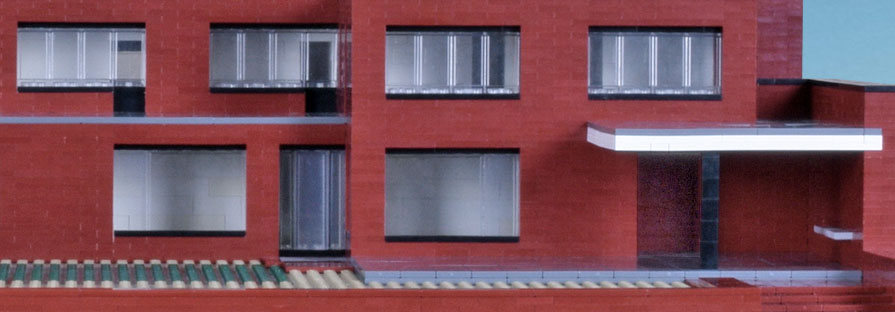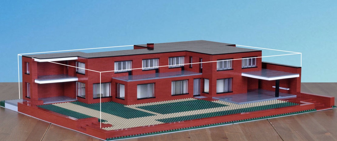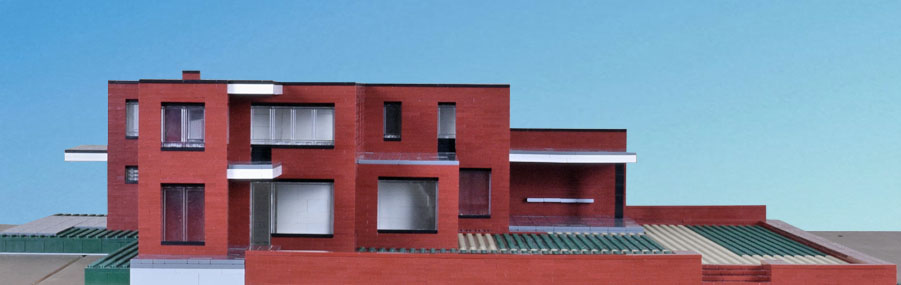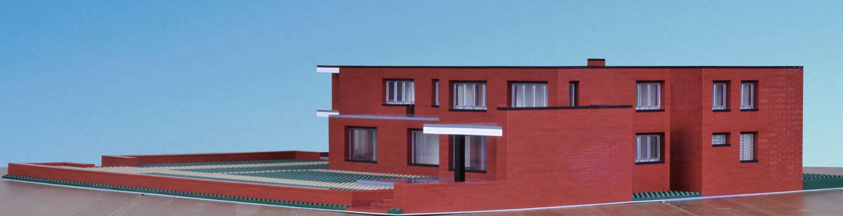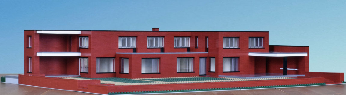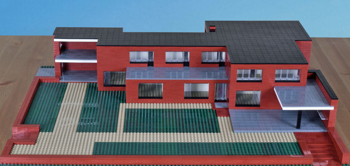 Overall dimensions are close, as is the positioning of the main elements. Expect variations within. Not modeled, details that accent—full trim, railing, gutters. The inset of the windows is exaggerated. Also the decks and drive are paved with brick with a different finish and slightly different color. I made them gray to separate the planes. Had I made them brick they would have blended in with the rest of the house and not been well distinguished in the model or the photographs. What I like about the model is that it highlights abstractly the planes and masses, showing them in greater relief, encouraging study of their interrelationships. I would like to see a version of the house in which the decks were covered with slate.