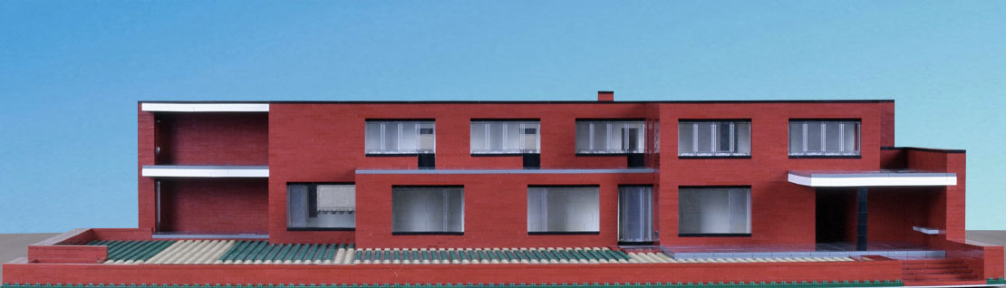 The front facade faces the street, provides protection and privacy from its traffic on the first floor, and has unassuming entry. Again mass and stability are restored, and here horizontally makes its most emphatic statement, reinforced especially in the long bands of windows on the second floor that, in their continuous run without brick mullions, seemingly defy support. The brick mass shifts right, the windows left, their planes interlocking.