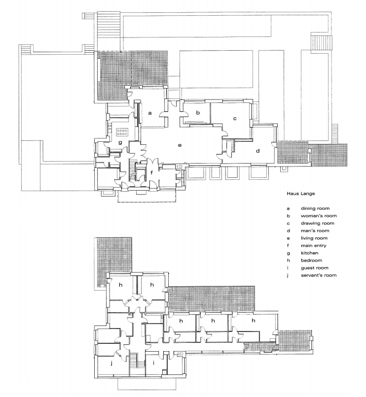 But the Brick Country House was an unbuilt concept, the Barcelona Pavilion an abstract exhibition piece with only a ghost of possible use. Most of his other residential work was planned for small families, or, in the case of the Farnsworth House, a single individual. Both Krefeld Villas were built for full families and had full programs. Haus Lange had seven bedrooms, including a guest room and servant’s quarters, all save the guest room with full baths, along with a living room, a dining room, a man’s room, a woman’s room, a drawing room, plus an assortment of utility rooms, meeting the demands of a compartmentalized lifestyle and a desire for privacy, the Langes perhaps having a foot in their past century.