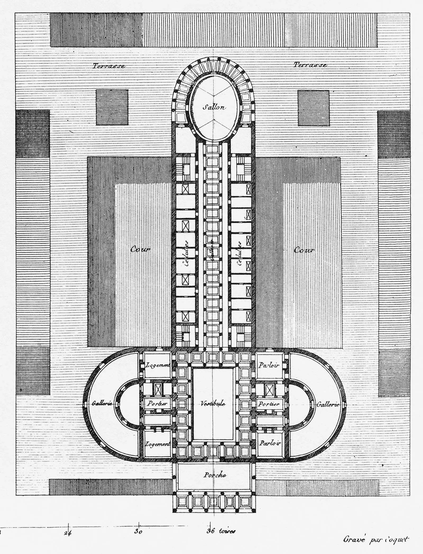 Other of Ledoux’s country homes are similar in their simplicity, symmetry, and three-part structure, base, body, head. Above, the design is closely repeated on four corners around a central court. It is a house for a father and his two sons and daughter, each unhappy in his or her own way, the family in discord.